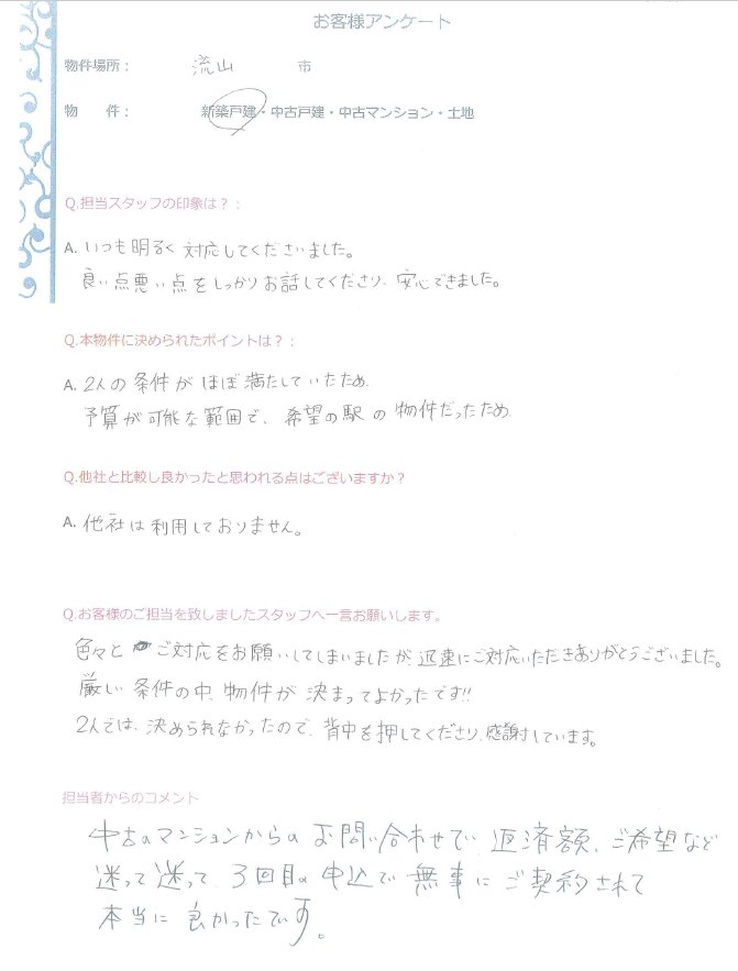 厳しい条件の中、物件が決まって良かったです!!