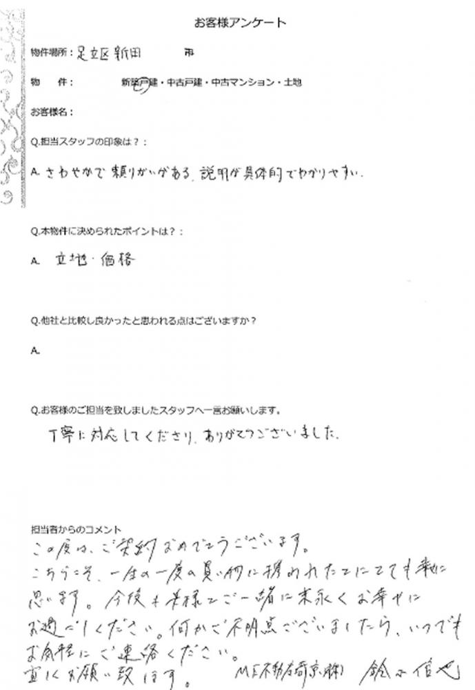 この度は、ご契約おめでとうございます。 こちらこそ、一生の一度の買い物に携われたことにとても幸せに 思います。今後も奥様とご一緒に末永くお幸せにお過ごしください。 何かご不明点ございましたら、いつでもお気軽にご連絡ください。 宜しくお願い致します。 ME不動産埼京(株)鈴木信也