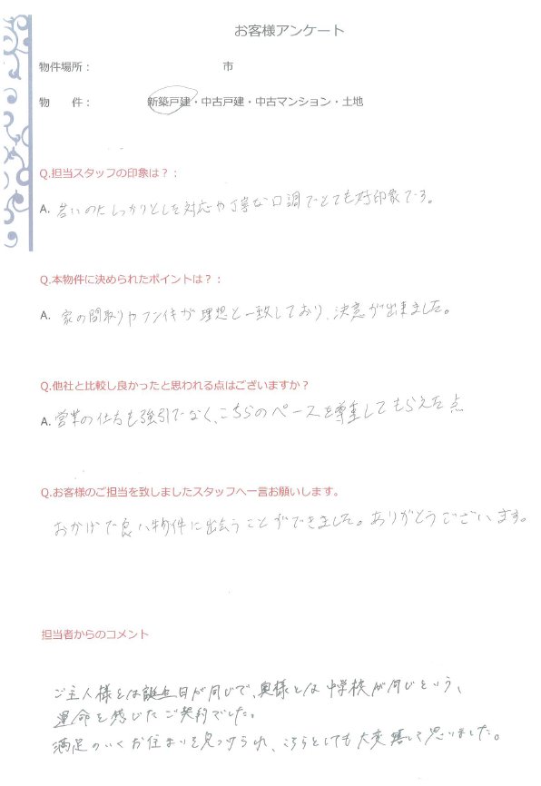 満足のいくお住まいを見つけられ。こちらとしても大変嬉しく思いました。