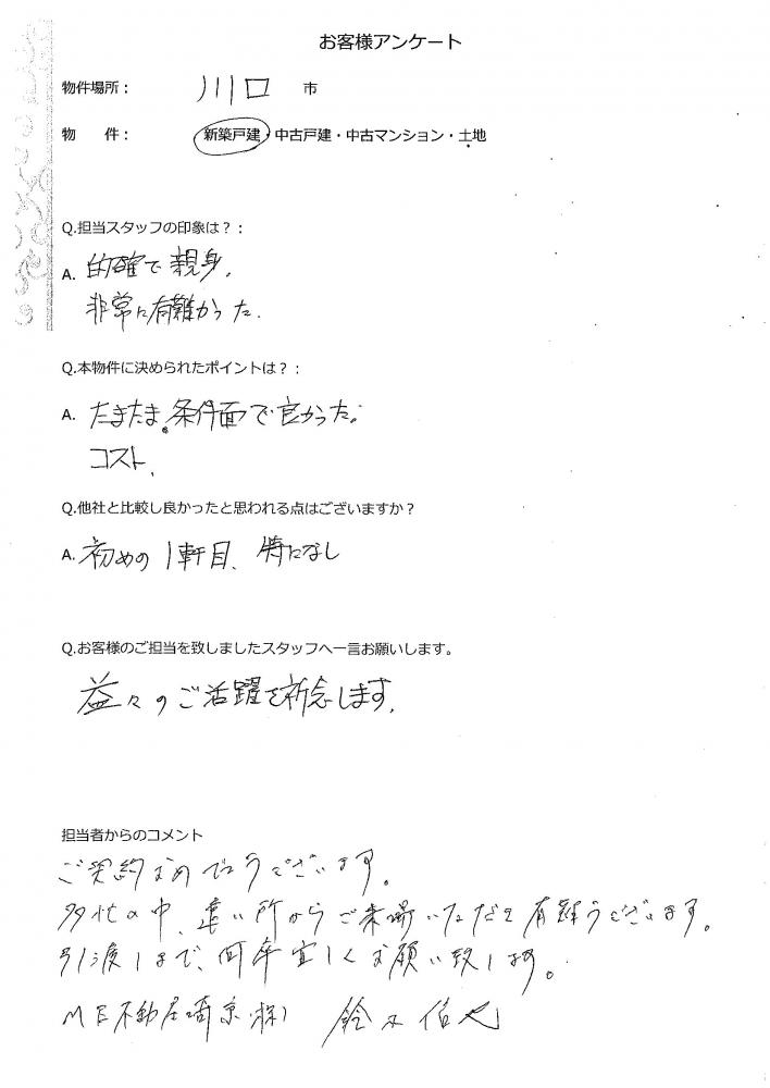 ご契約おめでとうございます 多忙の中、遠い所からご来店いただき有難うございます。 引渡しまで何卒宜しくお願い致します。 ME不動産埼京(株) 鈴木信也
